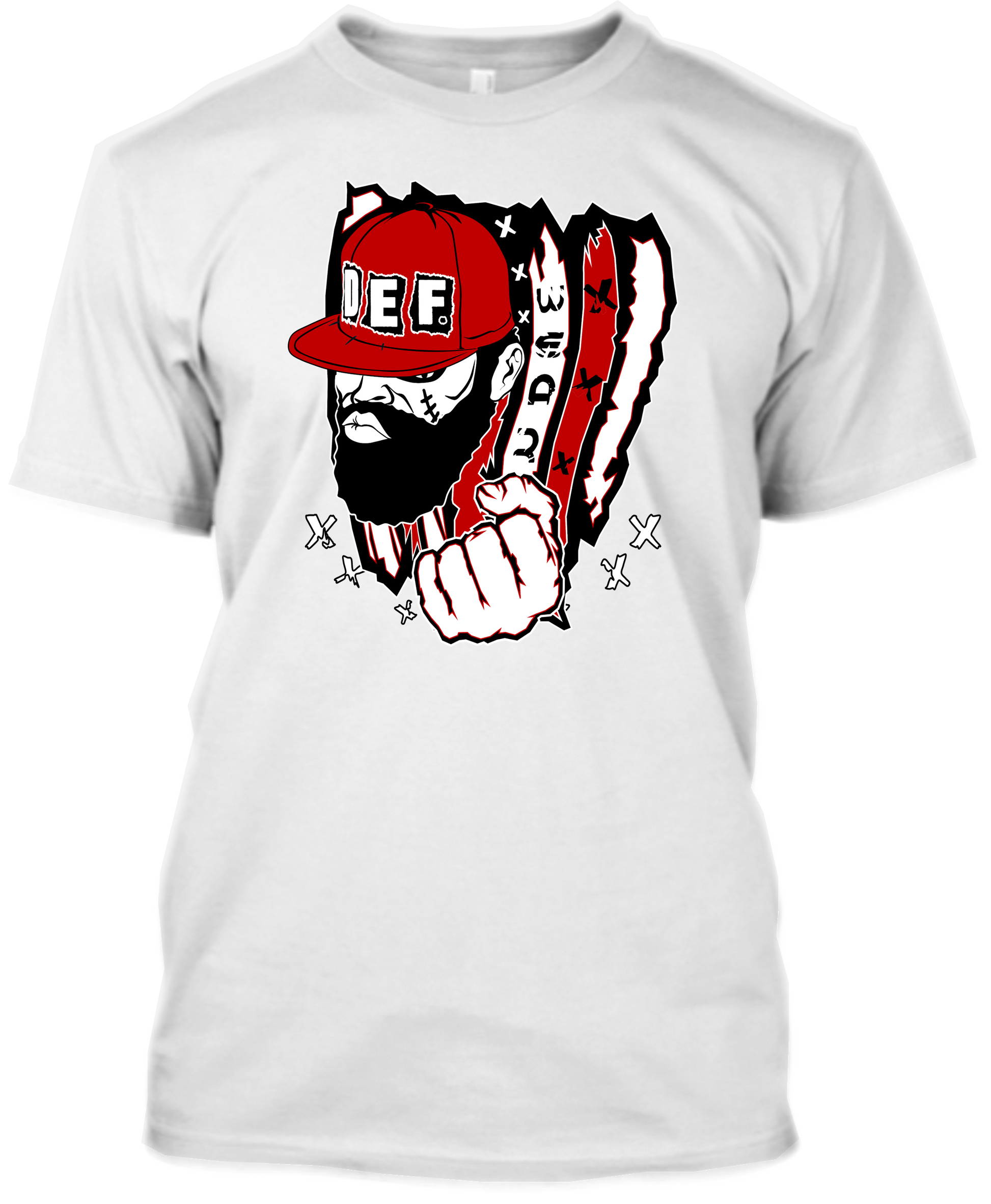 Bearded guy with defiant fist forward, with a hanging, tattered banner backdrop. The image is printed on a soft, 100 percent, ring spun cotton t-shirt. The Def. Wear logo printed on the right sleeve.